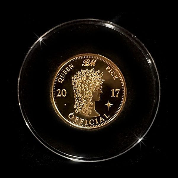 Edición limitada 2017 de moneda de seis peniques con doble cara bañadas en oro con las cabezas de «Brian May» y el robot de «News Of The World». Cantidades estrictamente muy limitadas disponibles a únicamente 1 por hogar.